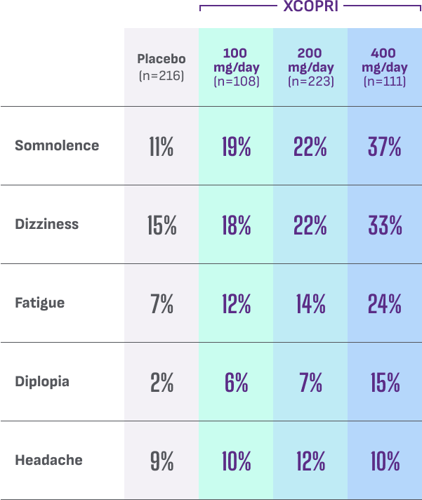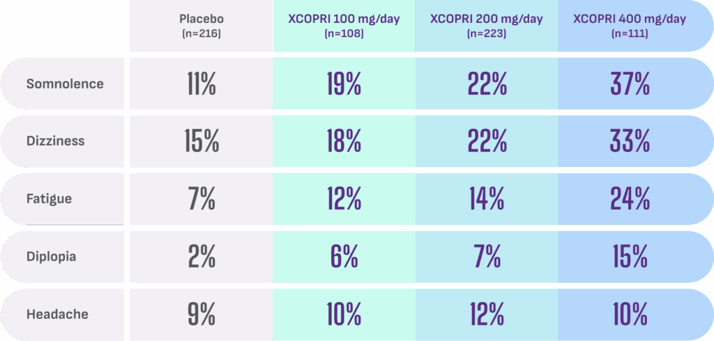 - Discontinuation rates due to adverse reactions were 11% (100 mg), 9% (200 mg), and 21% (400 mg) for patients on XCOPRI compared with 4% for patients on placebo1